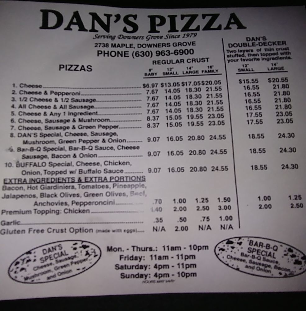 Introducing Dan's Pizza, a beloved pizza joint in Downers Grove, IL that boasts a simple yet creative menu filled with delicious options. From classic pizzas like Cheese and Pepperoni to specialty creations like Dan's Special and Barbq Special, there is something for every pizza lover. The thin crust is crispy and flavorful, and the toppings are always generous. Additionally, the sandwiches, including Beef N' Cheese and Italian Sausage, are also highly recommended. Customers rave about the friendly service, excellent food quality, and reasonable prices. Dan's Pizza is a go-to spot for those craving hot and fresh pizza, whether for dine-in, takeout, or delivery. With a loyal following and rave reviews, Dan's Pizza is a must-try for pizza enthusiasts in the area.
